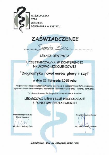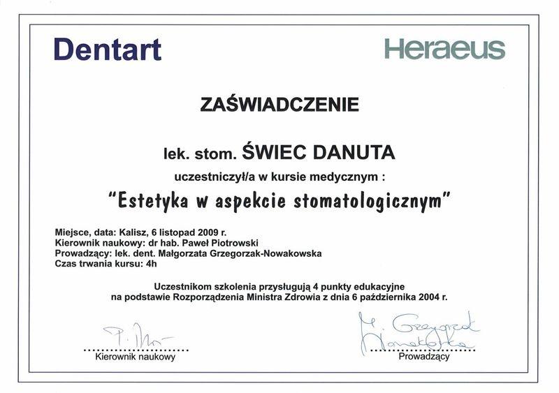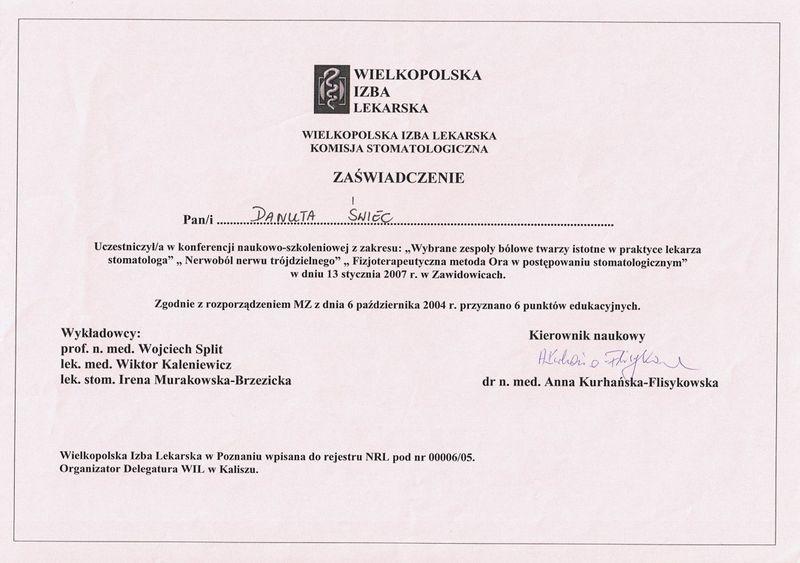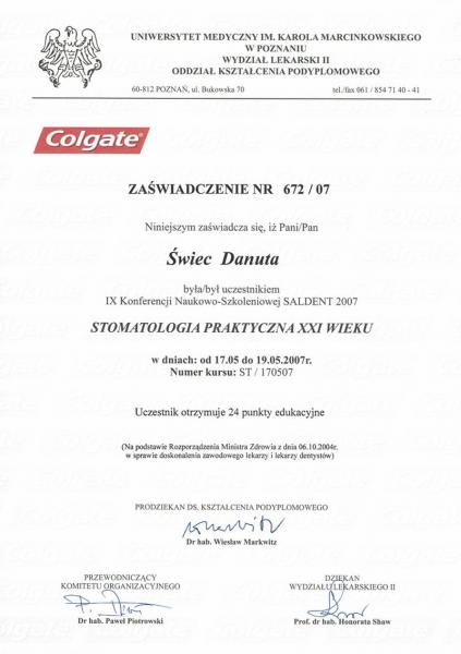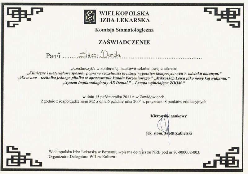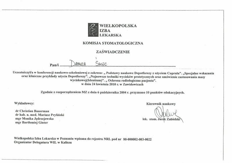 Certyfikaty Prezentujemy certyfikaty, zaświadczenia o ukończonych kursach i dyplomy stanowiące potwierdzenie doświadczenia i kompetencji zawodowych personelu Gabinetu Stomatologicznego Danuty Świec.